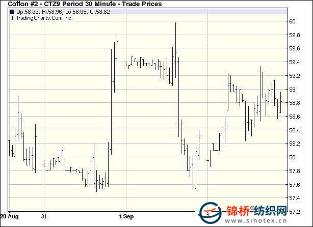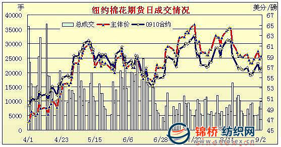 9月2日,紐約期棉受買(mǎi)盤(pán)支持,脫離外圍壓力,小幅收高,成交量較前一日有所縮減。受美國(guó)股市及商品期貨市場(chǎng)走弱影響,當(dāng)日期棉市場(chǎng)低開(kāi)低走。由于前一日大跌,市場(chǎng)中涌現(xiàn)部分貿(mào)易買(mǎi)盤(pán),此外還有投機(jī)及基金買(mǎi)盤(pán)支持,期棉低點(diǎn)反彈,主力12月合約最高至59.33美分/磅。接近尾盤(pán)時(shí)漲幅有所回落,最終小幅收漲。10月合約漲52點(diǎn),收于56.89美分/磅;12月合約漲56點(diǎn),收于58.91美分/磅。