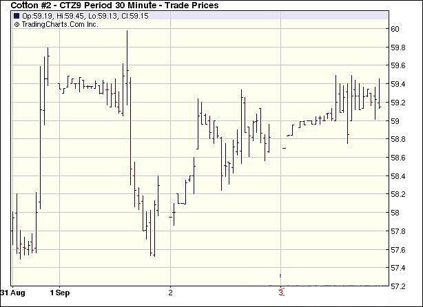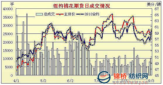 9月3日,美國公布8月份零售數(shù)據(jù)好于預(yù)期,美國股市走高,同時(shí)美棉出口數(shù)據(jù)強(qiáng)勁,提振期棉走強(qiáng),雖然外圍商品大多呈現(xiàn)弱勢,盤終期棉各合約小幅走高。當(dāng)日紐約期棉低開,不過期棉主力合約逐步攀高至59.49美分,有所回落,其后受利好的美棉出口數(shù)據(jù)支撐,期棉再度走強(qiáng),尾盤持續(xù)的買盤推動期棉收漲,10月近期合約收漲26點(diǎn)于57.15美分,而主力12月合約再漲33點(diǎn)收于59.24點(diǎn),不過成交清淡,期權(quán)成交僅僅包括100份看漲期權(quán)和90份看跌期權(quán)。據(jù)美國農(nóng)業(yè)部(USDA)公布,8.21-8.27一周美國凈簽約出口09/10年度陸地棉69286噸,較前一周增加31%。中國簽約進(jìn)口美棉增至2萬噸,可以看出不少國家趁低位加大了進(jìn)口量。 紐約棉花期貨主力0912合約近三個(gè)交易日交易走勢 |