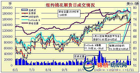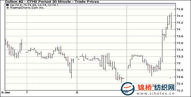 1月11日,美元繼續(xù)走弱,不過原油和大豆類商品繼續(xù)高位震蕩小幅回落,中國期棉上漲推動(dòng)紐約期棉扭轉(zhuǎn)連續(xù)的跌勢(shì)反抽大漲,近期合約漲180點(diǎn)報(bào)收于74.24美分/磅。當(dāng)日紐約期棉小幅高開,然后就在漲幅70點(diǎn)附近震蕩,但在中國鄭棉上漲,兼市場(chǎng)預(yù)計(jì)USDA將小幅調(diào)降美國產(chǎn)量,出口調(diào)增的預(yù)期下,資金開始拉升紐約期棉,3月合約上揚(yáng),在73.40美分和74.27美分處觸發(fā)止損買盤,最高揚(yáng)升至74.47美分/磅,尾盤小幅回落。盤終各合約普漲110點(diǎn)以上,近期3份合約漲幅逼近200點(diǎn),同時(shí)成交較前活躍,而期權(quán)買盤成交7200張,賣盤成交1900張。 紐約棉花期貨首期1003合約近三個(gè)交易日交易走勢(shì) |