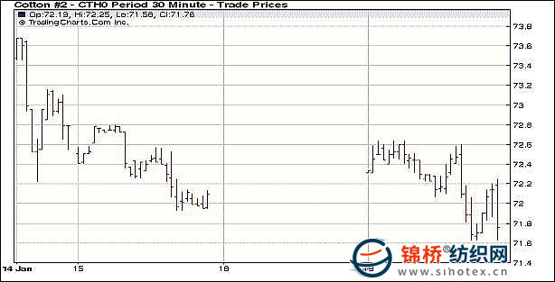 1月19日,美元走強(qiáng),美國股市大漲,但農(nóng)作物商品期貨疲弱,期棉窄幅震蕩,尾盤跌破支撐,再創(chuàng)近2個(gè)月的低位。當(dāng)日紐約期棉缺乏消息刺激,窄幅震蕩,同時(shí)外圍美元走強(qiáng),農(nóng)作物疲弱,連續(xù)回落,也為期棉帶來較強(qiáng)壓力,午盤后技術(shù)拋盤打壓期棉回落,跌破72美分的支撐位后,投機(jī)賣盤加大力度,盤終3月合約收跌44點(diǎn)至71.63美分,為近2個(gè)月的新低收盤價(jià)。分析師稱,支撐期棉上漲的3大因素近期均有所改變,因此期棉弱勢回落,三大因素是中國產(chǎn)量并未如之前傳言減幅巨大,全球消費(fèi)略有調(diào)減,競爭性作物價(jià)格紛紛回落。雖然中長期棉花基本面利好并未改變,但短線弱勢暫未改善。 紐約棉花期貨首期1003合約近三個(gè)交易日交易走勢 |