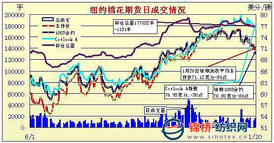 1月20日,市場(chǎng)避險(xiǎn)情緒升溫,美元大幅走強(qiáng),大宗商品普遍回落,期棉再度承壓下降,連續(xù)4天收陰,盤終3月合約跌84點(diǎn)收于70.80美分/磅。當(dāng)日期棉平開低走,全天低位運(yùn)行。受中國(guó)信貸收緊傳言,而歐洲經(jīng)濟(jì)樂觀情緒降溫,市場(chǎng)避險(xiǎn)需求大增,推動(dòng)美元大幅飆升,進(jìn)而導(dǎo)致整體商品市場(chǎng)普遍下跌,紐約期棉再遭投機(jī)賣盤拋售,連續(xù)下跌,3月合約跌破71美分,盤中最低觸及70.52美分/磅,之后得到商業(yè)買盤的支撐小幅縮窄跌幅,盤終各合約再度收跌,短線弱勢(shì)似乎仍未改變。 紐約棉花期貨首期1003合約近三個(gè)交易日交易走勢(shì) |
