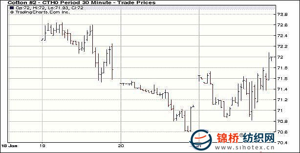 1月21日,美國總統(tǒng)誓言對(duì)大銀行進(jìn)行控制,兼中國信貸收緊,導(dǎo)致美國股市暴跌,美元繼續(xù)走強(qiáng),工業(yè)品期貨大多下跌,但農(nóng)產(chǎn)品終于從連續(xù)下跌中迎來小幅反彈,紐約期棉獲得貿(mào)易盤支撐,其中3月和5月合約收高105點(diǎn),其它合約也中幅收陽。當(dāng)日紐約期棉小幅高開后回落,但并未跌至前日收盤價(jià)之下,在四連陰之后,技術(shù)面也存在較強(qiáng)的反彈預(yù)期,貿(mào)易買盤和空頭回補(bǔ)推動(dòng)紐約期棉回升,尤其在尾盤半小時(shí)內(nèi)3月合約快速上揚(yáng),最高回升至72.08美分,盤終收于71.85美分/磅。中國12月份棉花進(jìn)口21.67萬噸,為2008年5月份以來進(jìn)口最高值。 紐約棉花期貨首期1003合約近三個(gè)交易日交易走勢(shì) |