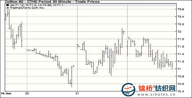 1月22日,美國總統(tǒng)對銀行監(jiān)管的不確定性促使美國股市大幅回落,大宗商品市場拋盤打壓,商品市場再度震蕩回落,紐約期棉窄幅區(qū)間震蕩下跌,盤終3月合約保住71美分的整數(shù)關(guān)口,各個合約前日漲幅基本抹掉。當(dāng)日紐約期棉平開低走,整個交易日3月主力合約基本在下方運行,雖然盤中期棉3月合約在71.10美分處獲得買盤支撐,但政府對于銀行監(jiān)管的不確定性促使股市再度大跌,商品市場浮現(xiàn)投機賣盤,大宗作物大多延續(xù)下跌,外圍利空致使紐約期棉前日漲幅喪失,尾盤20分鐘內(nèi),3月合約再度下跌,最低觸及70.98美分,并未探至前日低位70.82美分,盤終收于71.07美分。 紐約棉花期貨首期1003合約近三個交易日交易走勢 |