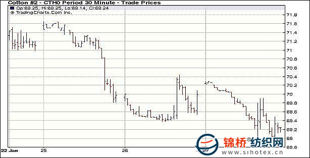 1月27日,美聯(lián)儲(chǔ)決定維持美國(guó)目前的低利率水平,提振美元,包括金屬,能源,農(nóng)產(chǎn)品等基本所有的大宗商品全線下挫為期棉帶來(lái)利空,紐約期棉再度承壓回落,盤終中幅下跌。當(dāng)日紐約期棉早盤高位運(yùn)行,但受外圍壓力緩慢回落,3月合約最低跌破前日的低位69.38美分,并探及69.03美分,逼近69美分整數(shù)關(guān)口,但投機(jī)賣盤減弱力量,同時(shí)貿(mào)易買盤積極介入,紐約期棉3月合約被迅速拉回,但外圍弱勢(shì)不改,3月合約再度被打壓探底,尾盤小幅回升,中副下跌收盤。 紐約棉花期貨首期1003合約近三個(gè)交易日交易走勢(shì) |