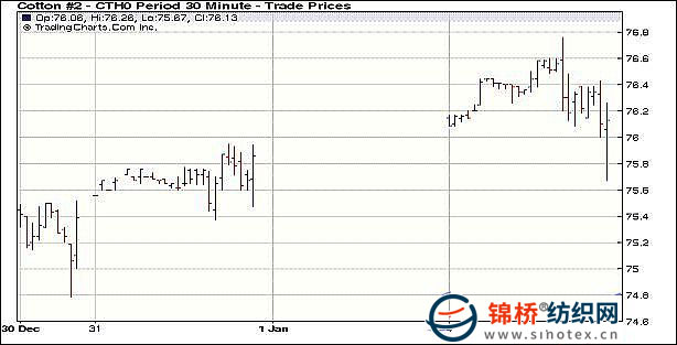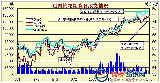 4日是2010年首個(gè)交易日,美元遭重挫,原油和黃金均大漲,帶動(dòng)農(nóng)產(chǎn)品走高,其中紐約期棉3月主力合約盤中再創(chuàng)16個(gè)月新高,盤終各合約小幅收漲。當(dāng)日期棉小幅高開,受益于美元大跌及外圍大漲利好,兼基金買盤涌入,期棉大幅沖高,其中3月合約最高攀至76.77美分,為16個(gè)月來(lái)高點(diǎn),但高位獲利賣盤壓力重挫期棉,致使期棉高位回落,盤終僅小幅收漲,當(dāng)日交投活躍,大幅放量。當(dāng)日紐約2月原油期貨大漲2.71%報(bào)每桶81.51美元。 紐約棉花期貨首期1003合約近三個(gè)交易日交易走勢(shì)