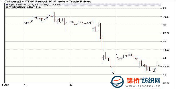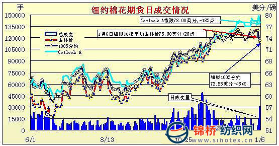 1月6日,美元沖高回落,原油繼續(xù)保持強勁上漲勢頭,紐約期棉在周二的大跌之后小幅反彈上漲,但反彈勢頭不強,盤終3月主力合約漲43點收于73.55美分/磅,5月合約漲43點收于74.73美分/磅。當日期棉開盤小幅沖高,在周二的暴跌之后買盤浮現,推動紐約期棉回升,盤中3月合約最高升至74.27美分/磅的位置,但午盤后漲幅回落,盤終收于73.55美分。整日交易,3月合約并未觸及周二的低位73.04美分/磅,顯示市場基本認可73美分/磅的近期支撐位。同時從ICE公布的數據可知,在周二的暴跌中,近期3月合約大幅減持近8000張。 紐約棉花期貨首期1003合約近三個交易日交易走勢 |