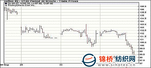 10月1日美元指數(shù)繼續(xù)大跌,農(nóng)產(chǎn)品期貨大幅走低,另美棉新花分級(jí)檢驗(yàn)量同比大增,紐約期棉遭遇獲利平倉(cāng)打壓,期棉快速下滑,盤(pán)終幾近于跌停,期棉10月和12月合約均收于100美分之下。當(dāng)日紐約期棉小幅高開(kāi),之后維持窄幅區(qū)間震蕩,然午盤(pán)后期棉一路下滑,沒(méi)有回頭之勢(shì),獲利平倉(cāng)賣盤(pán)兼止損賣盤(pán)打壓,導(dǎo)致期棉12月合約一路跌至97.92美分,盤(pán)終以98.02美分收盤(pán)。市場(chǎng)分析認(rèn)為,其一,外圍大宗農(nóng)產(chǎn)品普遍走勢(shì)低迷;其二,美棉新花上市量日漸增加,同時(shí)品質(zhì)較佳;其三,中國(guó)進(jìn)入長(zhǎng)假,國(guó)內(nèi)交易暫停。從技術(shù)上來(lái)看,期棉有繼續(xù)回落的態(tài)勢(shì)。