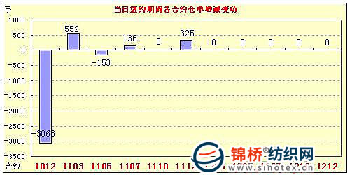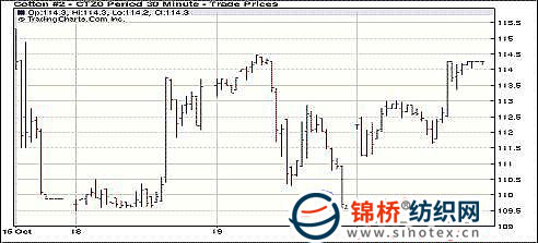 10月20日美元走弱,商品市場整體上揚,紐約期棉受外圍帶動大幅反彈,收于漲停,全面收回前一日跌幅。當日市場高開高走,因美元走勢下滑,商品市場受到投機買盤的支持,原油、大豆及玉米等均紛紛走強,紐約期棉受到外圍市場帶動,在買盤支持下,大幅攀升并達到漲停板。盤終12月合約收于114.26美分/磅,漲400點;3月合約收于109.21美分/磅,漲400點;其它遠期合約漲幅較小。 紐約棉花期貨近期1012合約近三個交易日交易走勢 |