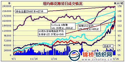 10月26日,紐約期棉繼續(xù)瘋狂走勢,放量大幅上漲,盤終3月合約收漲600點(diǎn),再破歷史新高。當(dāng)日紐約期棉漲跌幅度擴(kuò)至600點(diǎn),期棉繼續(xù)大幅走高,瘋狂上漲,部分商業(yè)盤選擇在增加保證金之前撤離,進(jìn)一步增添上漲動力,而中國國內(nèi)的棉花漲勢也刺激期棉進(jìn)一步走高,近期合約盤中觸及漲停位,但尾盤未能收于漲停,成交大幅放量,本年度合約全線大幅收漲,甚至下年度10月合約也第一次大幅上漲259點(diǎn)。 紐約棉花期貨近期1012合約近三個交易日交易走勢 棉商套保 期棉創(chuàng)新紀(jì)錄 |