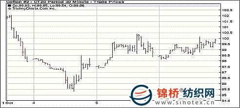 10月6日美元繼續(xù)弱勢,大宗商品表現(xiàn)不弱,紐約期棉高開回落,午盤后再度走高,尾盤12月合約漲119點收于99.75美分/磅,逼近1美元整數(shù)位。當日期棉小幅高開,但交投稀少,后續(xù)買盤缺失,期棉快速回落,早盤于低位窄幅震蕩,臨近尾盤,主力合約再度走高,最高沖至100.14美分,但高位壓力較重,尾盤收于100美分之下。美元弱勢支撐大宗商品走強,然而期棉參與者大多靜候中國節(jié)后開盤,已經(jīng)USDA最新月度報告,因此交投不旺。 紐約棉花期貨主力1012合約近三個交易日交易走勢 |