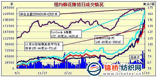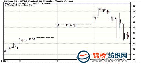 10日紐約期棉在早盤(pán)漲停的情況下盤(pán)中出現(xiàn)跌停,整日交易波動(dòng)幅度達(dá)到1200點(diǎn),最終市場(chǎng)以全面下跌收盤(pán),近期12月合約結(jié)算價(jià)145.65美分/磅,跌558點(diǎn),1103月合約封于跌停板,結(jié)算價(jià)141.11美分/磅。市場(chǎng)總成交量超過(guò)10萬(wàn)手,超過(guò)2008年2月15日創(chuàng)下的85945手的紀(jì)錄。當(dāng)日市場(chǎng)開(kāi)盤(pán)迅速走強(qiáng),12月合約不到一個(gè)小時(shí)即漲停,達(dá)到157.23美分(創(chuàng)下歷史最高紀(jì)錄)。好景不長(zhǎng),市場(chǎng)從高位一路下滑,中國(guó)央行采取了控制流動(dòng)性措施,要求銀行將準(zhǔn)備金率提高0.5%,市場(chǎng)人士分析,這一舉措表明了中國(guó)抑制通貨膨脹的用意,商品市場(chǎng)價(jià)格漲勢(shì)受到影響,中國(guó)棉花電子盤(pán)交易和ICE期棉盤(pán)中均出現(xiàn)跳水,12月合約盤(pán)中現(xiàn)跌停。交易尾段有貿(mào)易商買(mǎi)盤(pán)和期權(quán)買(mǎi)盤(pán)介入,12月合約回補(bǔ)少量跌幅,最終收跌558點(diǎn)。 紐約棉花期貨近期1012合約近三個(gè)交易日交易走勢(shì) 期棉接近跌停板 2010年11月10日道瓊斯期貨消息:周三十二月份合約收盤(pán)價(jià)每磅1.4565美元,降5.58美分(接近跌平板的6美分),跌幅4%。某資深分析師認(rèn)為市場(chǎng)已呈現(xiàn)向下趨勢(shì),但市場(chǎng)策略師湯姆·米庫(kù)斯基評(píng)論稱,中國(guó)的歉收和持續(xù)需求仍然支撐棉價(jià),美國(guó)農(nóng)業(yè)部預(yù)測(cè)中國(guó)的期末庫(kù)存為1925年來(lái)最低水平。 |