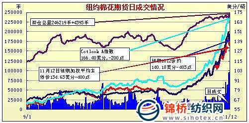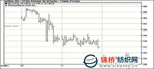 11月12日,市場預(yù)期中國將很快再度升息,因此資本市場大幅下滑,同時中國期貨和股市暴跌,紐約期棉受不利影響,高危區(qū)再度下挫。近期12月合約逼近跌停,而2011年度三份合約均以500點下跌收盤,連續(xù)三日大幅下跌。當(dāng)日紐約期棉亞洲交易盤大幅低開,承受中國期棉快四跌停之影響,小幅震蕩后即步入500點跌停,雖然之后有少許紡企買盤承接,跌停打開數(shù)次,但賣盤壓力巨大,同時外圍市場紛紛跌停,為紐約期棉帶來沉重壓力,最終收于跌停,成交較前日大幅縮量。