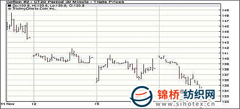 11月16日紐約期棉在美元上漲及原油等大宗商品期貨價(jià)格普遍大幅下跌的影響下,以全面下跌收盤,近期12月合約和主力3月合約均以跌停收盤,結(jié)算價(jià)分別為133.75和129.20美分/磅。當(dāng)日市場穩(wěn)定開盤,12月合約早盤重回140美分以上,但因外部市場壓力過大,市場未能繼續(xù)上揚(yáng),延續(xù)多日來的下跌勢(shì)頭,最終前四份合約封于跌停板。從11月10日以來市場連續(xù)下滑,距離最高點(diǎn)157.23美分,12月合約已經(jīng)累計(jì)下跌了2348點(diǎn)。經(jīng)濟(jì)層面上,歐盟官員努力防止愛爾蘭債務(wù)危機(jī)惡化成希臘式的災(zāi)難;中國可能加息的前景令投資者感到恐慌;美聯(lián)儲(chǔ)最近采取的行動(dòng)遭到越來越多的批評(píng)。對(duì)中國加息前景的恐慌情緒導(dǎo)致16日原油等大宗商品期貨價(jià)格普遍大幅下跌。隨著大宗商品期貨及其相關(guān)股票下跌,一些投資者指出,外部市場正在回吐美聯(lián)儲(chǔ)宣布回購6000億美元國債之前的漲幅。另外,11月17日市場的漲跌停板幅度將擴(kuò)大到600點(diǎn)。 紐約棉花期貨近期1012合約近三個(gè)交易日交易走勢(shì)