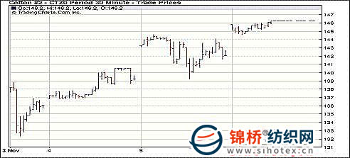 11月8日紐約期棉前五份合約全部漲停,之后合約遭遇賣盤打壓小幅下滑。近期12月合約收于歷史最高點146.23美分/磅,1103月合約收于142.11美分。當(dāng)日市場高開低走,盤中中國電子盤市場走強,內(nèi)外市場聯(lián)動,紐約期棉從低點反彈,外部市場美元走強,商品市場部分品種仍上揚,期棉觸及漲停板后封于頂點。交易商預(yù)期USDA 11月份報告中將調(diào)低中國棉花產(chǎn)量,為滿足棉花需求,需要進口更多的棉花。這一預(yù)期對紐約期棉市場也形成支持。 紐約棉花期貨近期1012合約近三個交易日交易走勢 |