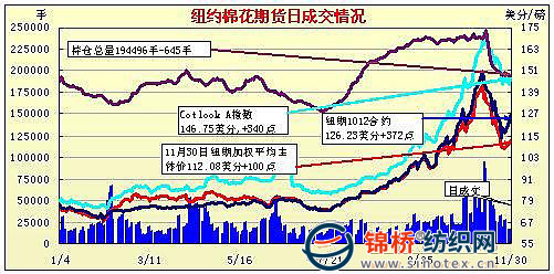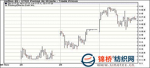 11月30日紐約期棉受外圍帶動,在買盤支持下連續(xù)第二天上揚,主力合約漲幅過百;整體成交量較前周水平仍較為清淡。12月1日紐約期棉漲跌停板幅度縮小至400點。當(dāng)日棉市早盤下滑,主力3月合約最低至113.76美分/磅;后買盤發(fā)力,促棉價大幅反彈,最高達(dá)118.90美分/磅,漲幅達(dá)314點。盤終前五個合約大幅收漲,近期12月合約收于126.23美分/磅,漲372點;3月合約收于117.34美分/磅,漲158點;遠(yuǎn)期合約漲跌不一。 紐約棉花期貨近期1103合約近三個交易日交易走勢 |