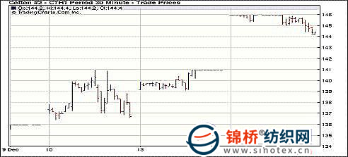 12月14日紐約期棉主力合約盤中觸漲停板,最終大幅收漲。當(dāng)日棉市跳空高開,迅速沖擊漲停板。因中國11月棉花進(jìn)口量及紗線產(chǎn)量增加,為紐約期棉帶來利好。主力3月合約數(shù)次觸漲停板145.97美分/磅,但接近尾盤時有所回落。盤終3月合約收于144.49美分/磅,漲352點;5月合約收于136.38美分/磅,漲315點。