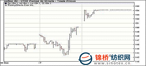 12月20日紐約期棉大幅上揚(yáng),近期合約再度收于漲停板,當(dāng)日成交量有所減少。當(dāng)日棉市小幅高開,受期權(quán)市場的帶動(dòng),近期合約快速?zèng)_高,很快觸漲停板,且之后一直封死漲停板,直至收盤。盤終前四個(gè)合約均收于漲停板,3月合約收于154.12美分/磅,漲400點(diǎn),打破紐約期棉近期合約于今年11月9日創(chuàng)下的歷史最高紀(jì)錄151.23美分/磅;5月合約收于142.39美分/磅,漲400點(diǎn)。目前市場上漲,仍主要因棉花自身基本面的利好;同時(shí)當(dāng)日美國股市及商品期貨市場普遍收高。 紐約棉花期貨近期1103合約近三個(gè)交易日交易走勢 |