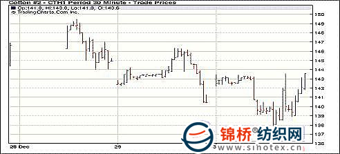 12月30日,紐約期棉近期3月合約在連續(xù)5個(gè)交易日連續(xù)下跌之后,終于迎來(lái)反彈,當(dāng)日期棉合約全部收漲。當(dāng)日市場(chǎng)平開(kāi),早盤(pán)窄幅震蕩,后有大量賣盤(pán)涌入市場(chǎng),近期合約被打壓至當(dāng)日最低點(diǎn)137.55美分/磅。之后買盤(pán)逐漸回到市場(chǎng),價(jià)格出現(xiàn)反彈。但隨著賣盤(pán)第二撥打壓,價(jià)格再度下滑,至21日移動(dòng)平均值139.66美分/磅,很快隨著后續(xù)買盤(pán)的支撐,最終3月合約低點(diǎn)反彈并大幅收漲。盤(pán)終3月合約收于142.84美分/磅,漲241點(diǎn);5月合約收于135.23美分/磅,漲355點(diǎn)。 紐約棉花期貨近期1103合約近三個(gè)交易日交易走勢(shì) |