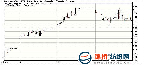 經(jīng)過上周五日連陽四漲停累漲2058點(18.4%)之后,12月6日期棉全面收跌,主力3月合約在128美分/磅之上獲得支撐,跌幅接近200點。當日市場高開低走。美元走強,原油及谷物期貨普遍下滑,對ICE期棉形成拖拽。主力3月合約大幅下跌,最低至128.03美分/磅,跌幅431點,隨后該點獲得買盤支持有所反彈,未跌破128美分關(guān)鍵支撐位。盤終各合約收跌,近期12月合約收于141.92美分/磅,跌41點;3月合約收于130.43美分/磅,跌191點。市場傳言稱印度可能對12月15日截止的裝運期進行延期,對市場形成利空。 紐約棉花期貨近期1103合約近三個交易日交易走勢 |