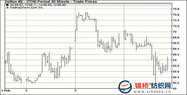 2月4日,受壓于外部市場(chǎng),紐約期棉在連續(xù)上漲兩個(gè)交易日后中幅收跌,近期3月合約結(jié)算價(jià)68.99美分/磅,跌83點(diǎn),1005月合約收于70.50美分/磅,跌85點(diǎn)。當(dāng)日市場(chǎng)開盤走弱,近期3月合約迅速下跌,跌幅超過百點(diǎn),最低點(diǎn)至68.21美分/磅。美元指數(shù)走強(qiáng),對(duì)商品市場(chǎng)形成壓力,原油、黃金和美國股市“應(yīng)聲下跌”,期棉未能“獨(dú)善其身”。交易后期,少量貿(mào)易買盤將期棉市場(chǎng)從低點(diǎn)拉升,市場(chǎng)回補(bǔ)部分跌幅,多數(shù)合約終收跌于100點(diǎn)之下。 紐約棉花期貨首期1003合約近三個(gè)交易日交易走勢(shì) |