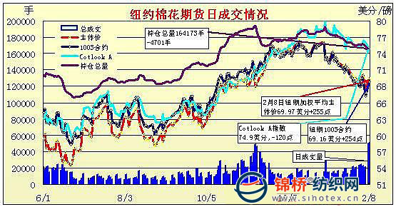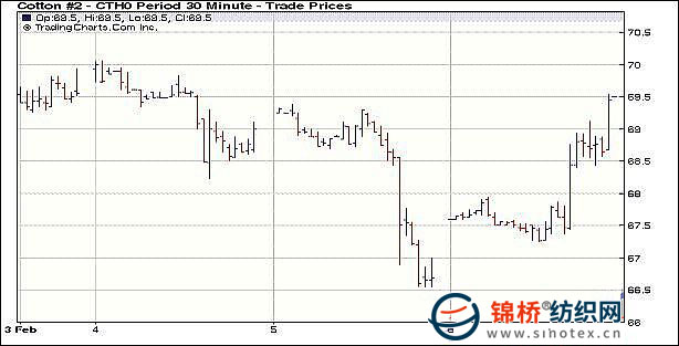 2月8日紐約期棉受外部市場(chǎng)利好支持大幅反彈,補(bǔ)盡前一日跌幅,近期3月合約收于69.16美分/磅,漲254點(diǎn),1005月合約收于70.76美分/磅,漲253點(diǎn)。當(dāng)日市場(chǎng)前大半個(gè)交易日窄幅波動(dòng)。美元在上周持續(xù)走強(qiáng)后,本周一掉頭下跌,促使整個(gè)商品市場(chǎng)強(qiáng)勢(shì)反彈,期棉受到惠及,引發(fā)大量空頭平倉(cāng),市場(chǎng)大幅上揚(yáng),近期3月合約漲幅突破200點(diǎn)以上,最終收于高位。分析師指出,2月9日USDA(美國(guó)農(nóng)業(yè)部)將發(fā)布供需預(yù)測(cè)報(bào)告,市場(chǎng)預(yù)期美棉出口量將調(diào)增,期末庫(kù)存相應(yīng)減少,對(duì)期棉市場(chǎng)屬于利好性質(zhì)。多數(shù)合約終收跌于100點(diǎn)之下。 紐約棉花期貨首期1003合約近三個(gè)交易日交易走勢(shì) |