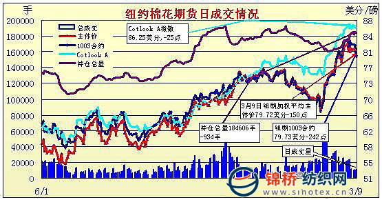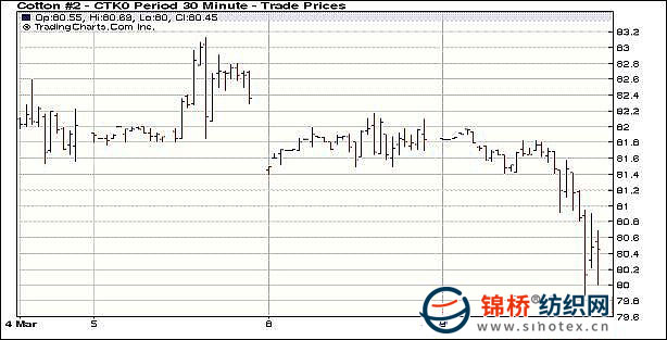 3月9日紐約期棉因賣盤活躍,期棉前三個(gè)合約收跌200點(diǎn)左右,其它合約有小幅漲跌。當(dāng)日期棉市場(chǎng)平開(kāi)后微幅震蕩。因美元上漲,商品期貨市場(chǎng)普遍走弱。受外圍市場(chǎng)影響,午盤后期棉賣盤涌現(xiàn),主力合約迅速下滑,并跌至最低79.81美分/磅;后低位部分買盤支持,價(jià)格小幅反彈,回升至80美分以上。盤終前3個(gè)合約收跌200點(diǎn)左右,近期3月合約收于79.73美分/磅,跌242點(diǎn);主力合約收于80.33美分/磅,跌171點(diǎn),為近兩周來(lái)最低點(diǎn);10年10月及12月合約微幅收漲;其它遠(yuǎn)期合約小幅收跌。 紐約棉花期貨主力1005合約近三個(gè)交易日交易走勢(shì) |