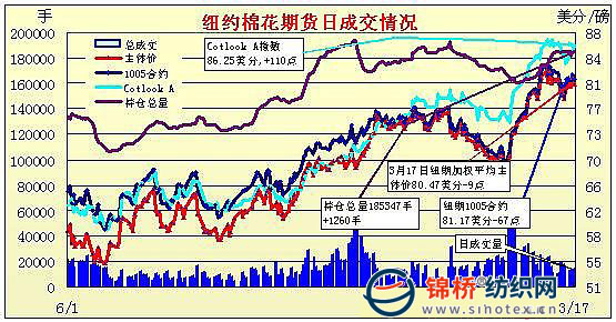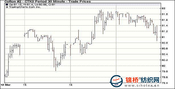 3月17日紐約期棉成交清淡,市場仍以觀望為主,在賣盤打壓下,期棉中幅收跌。當(dāng)日期棉市場高開低走,5月合約開盤最高至81.90美分/磅。雖然昨日美元走弱,外圍谷物市場走強(qiáng),但期棉受到賣盤打壓,價(jià)格走弱,盤終中幅收低。5月合約收于81.17美分/磅,跌67點(diǎn);7月合約收于81.99美分/磅,跌40點(diǎn)。 紐約棉花期貨近期1005合約近三個(gè)交易日交易走勢(shì) |