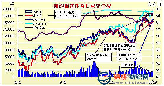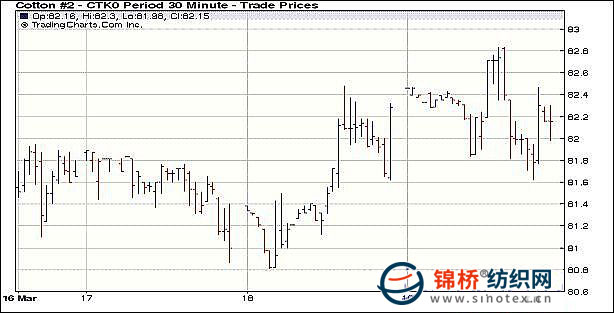 3月19日紐約期棉成交清淡,受外圍市場(chǎng)影響,在賣盤打壓下微幅收跌。當(dāng)日市場(chǎng)高開低走,開盤后微幅震蕩,午盤時(shí)一度走高,5月合約最高至82.83美分/磅。后美元走強(qiáng),施壓于商品市場(chǎng),谷物、原油及黃金紛紛走弱,期棉市場(chǎng)受外圍拖拽,價(jià)格下滑,盤終微幅收跌,5月合約收于82.18美分/磅,跌3點(diǎn);7月合約收于82.98美分/磅,跌6點(diǎn);其它遠(yuǎn)期合約漲跌不一。 紐約棉花期貨近期1005合約近三個(gè)交易日交易走勢(shì) |