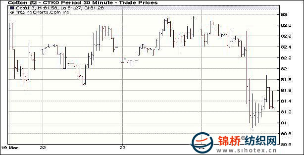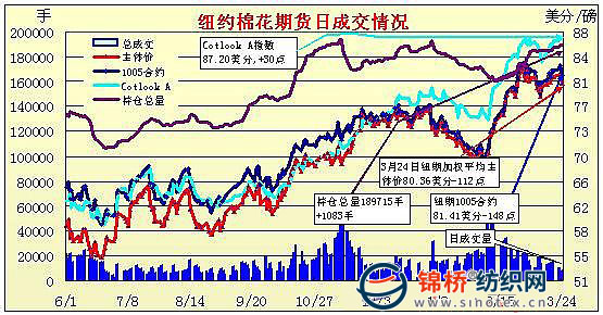 3月24日紐約期棉受美元走勢(shì)的影響,在投機(jī)賣(mài)盤(pán)打壓下大幅收跌百點(diǎn)以上,收盤(pán)價(jià)為一周來(lái)最低點(diǎn)。當(dāng)日市場(chǎng)小幅低開(kāi),早盤(pán)一度走強(qiáng),5月合約最高至82.96美分/磅,隨后震蕩走弱,午盤(pán)后由于美元強(qiáng)勁上漲,導(dǎo)致投機(jī)賣(mài)盤(pán)活躍,期棉大幅走低并觸發(fā)止損賣(mài)盤(pán),加快下滑速度,盤(pán)終5月合約收于81.41美分/磅,跌148點(diǎn);7月合約收于82.26美分/磅,跌142點(diǎn);遠(yuǎn)期合約相對(duì)強(qiáng)勢(shì),中幅收跌。 紐約棉花期貨近期1005合約近三個(gè)交易日交易走勢(shì) |