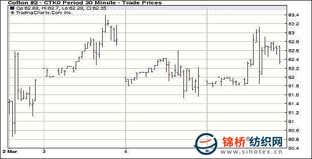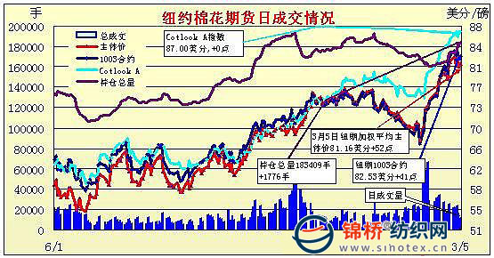 3月5日,美國經(jīng)濟前景向好的預(yù)期繼續(xù)給商品市場增添樂觀情緒。當(dāng)日,商品期貨普遍走強,支撐紐約期棉小幅收高。分析師認(rèn)為,84.60美分或成為棉價近期的頂部,但在80美分以下應(yīng)有良好的現(xiàn)貨支撐。另外,如果價格跌至81.50美分以下可能引發(fā)技術(shù)性賣盤。當(dāng)日5月合約開盤價81.90(美分/磅,下同),最高價83.12,最低價81.77,收盤價82.40,結(jié)算價82.53,漲61點,當(dāng)日登記庫存618420包,增加17432包,57516包待驗,成交量10270手,減少了604手。 紐約棉花期貨主力1005合約近三個交易日交易走勢 |