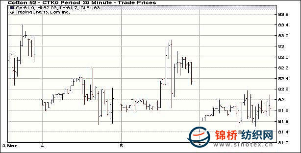 3月8日紐約期棉交投清淡,觀望為主,在少量賣盤打壓下,期棉主力合約走弱并小幅收跌,遠期合約相對強勢。當(dāng)日期棉市場平開低走,在部分獲利回吐賣盤打壓下主力合約最低至81.34美分/磅;此外美元走強施壓于美國股市,也為棉市帶來利空。后低位買盤介入,棉價略有反彈,盤終前4個合約小幅收跌,近期3月合約收于82.15美分/磅,跌38點;主力5月合約收于82.04美分/磅,跌39點;其它遠期合約微幅收漲。由于USDA報告將于明日公布,因此市場觀望氣氛濃厚,靜候新的指引。 紐約棉花期貨主力1005合約近三個交易日交易走勢 |