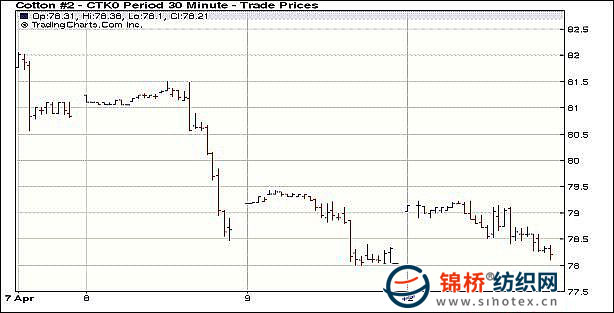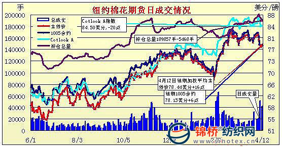 4月12日歐盟和國(guó)際貨幣基金組織(IMF)救助希臘為歐元帶來利好,美元大幅走跌,然而大宗商品漲跌互現(xiàn),紐約期棉高位震蕩后回落,盤終近期數(shù)份合約微弱收漲,遠(yuǎn)期合約下跌收盤。在連續(xù)下跌后,期棉存在一定的技術(shù)反彈走勢(shì)。12日紐約期棉小幅高開,高位窄幅波動(dòng),投機(jī)多單繼續(xù)撤離,但低位貿(mào)易買盤承接力較強(qiáng);同時(shí)偏緊的基本面也抑制期棉的回落。第一交割通知日臨近,移倉明顯,7月合約成為主力合約。外圍市場(chǎng),美元指數(shù)大幅下跌,美國(guó)道瓊斯股指19個(gè)月來首度突破1.1萬點(diǎn)。 紐約棉花期貨近期1005合約近三個(gè)交易日交易走勢(shì) |