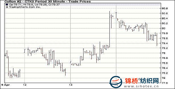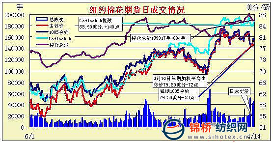 4月14日美聯(lián)儲公布褐皮書,低利率有望繼續(xù)維持,美元大幅走低;同時美國零售數(shù)據(jù)利好,另外預(yù)計中國第一季度經(jīng)濟數(shù)據(jù)增長強勁,促使全球股市和大宗商品強勢走高,但是紐約期棉未受外圍利好影響,從高位震蕩回落,部分原因在于中國簽約進口印度棉花,棉紗等產(chǎn)品,盤終大多數(shù)合約小幅回落50點左右。當(dāng)日紐約期棉小幅高開,外圍市場在經(jīng)濟樂觀形勢下強勢上揚,尤其金屬和原油市場,但ICE期棉無明顯利好消息,再度揚升困難,同時由于周二大幅走強后,現(xiàn)貨交投趨弱,盤中期棉合約震蕩回落,轉(zhuǎn)倉交投繼續(xù)主導(dǎo)交易,盤終縮量回落,但跌幅有限. 紐約棉花期貨近期1005合約近三個交易日交易走勢 |