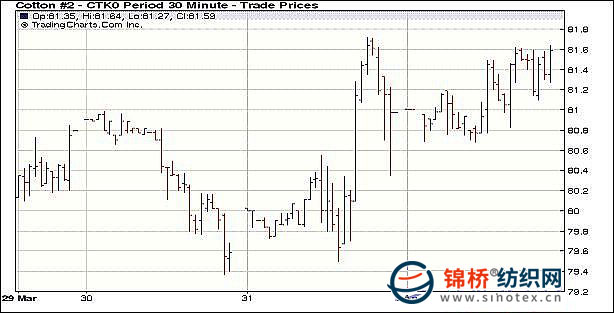 4月1日USDA發(fā)布美棉出口周報(bào),上周陸地棉出口較四周均值高35%,同時(shí)外圍利好,美元大幅走跌,原油走強(qiáng),盤(pán)終5月合約漲95點(diǎn)收于81.50美分。當(dāng)日紐約期棉高開(kāi)高走,外圍經(jīng)濟(jì)數(shù)據(jù)利好,推動(dòng)美元收跌,股市走強(qiáng),美棉出口利好為主要推動(dòng)力,同時(shí)面臨復(fù)活節(jié)假期,因此成交較前日縮量,5月主力合約延續(xù)強(qiáng)勢(shì),中幅收漲。據(jù)美國(guó)農(nóng)業(yè)部公布,3.19-3.25一周美國(guó)凈簽約出口本年度陸地棉47015噸,較前周增1.4倍,較近四周平均值增35%。美國(guó)ISM制造業(yè)指數(shù)創(chuàng)六年來(lái)最大漲幅,同時(shí)中國(guó)制造業(yè)指數(shù)繼續(xù)利好,利好全球股市和大宗商品。 紐約棉花期貨近期1005合約近三個(gè)交易日交易走勢(shì) |
