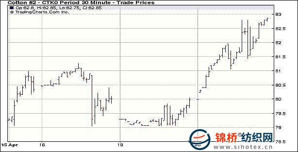 4月20日高盛預(yù)期第一季度盈利飆升近一倍,國際金融市場超跌反彈,大宗商品反彈走高;同時印度政府暫停棉花出口登記刺激紐約期棉近期和主力合約強勢走高,放量漲停報收,新作合約漲幅較小。當(dāng)日紐約期棉基本平開,但穩(wěn)步走高,由于印度政府為了調(diào)控國內(nèi)猛漲的棉價,決定暫停棉花出口,受此利好刺激,投機買盤拉動ICE期棉強勢攀高,觸發(fā)止損買盤,進一步揚升,盤終近期5月合約和7月合約漲停報收,突破前期高點。 紐約棉花期貨近期1005合約近三個交易日交易走勢 |