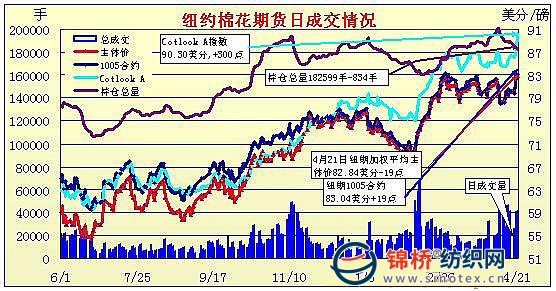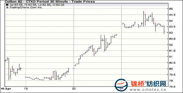 4月21日,國際貨幣基金組織宣布上調(diào)2010年全球GDP增長率。CBOT大豆繼續(xù)走強(qiáng),紐約期棉延續(xù)強(qiáng)勢,盤中漲至2年來新高位,盤終7月主力合約漲55點(diǎn)收于85.15美分。當(dāng)日紐約期棉小幅高開,投機(jī)買盤和技術(shù)買盤推動(dòng)期棉強(qiáng)勢走高,紐約期棉當(dāng)日漲跌停幅度擴(kuò)至400點(diǎn),盤中7月合約最高沖至86.80美分,為近兩年來的高位,高位獲利賣盤打壓,漲幅收窄,盤終僅小幅收漲。 紐約棉花期貨近期1005合約近三個(gè)交易日交易走勢 |