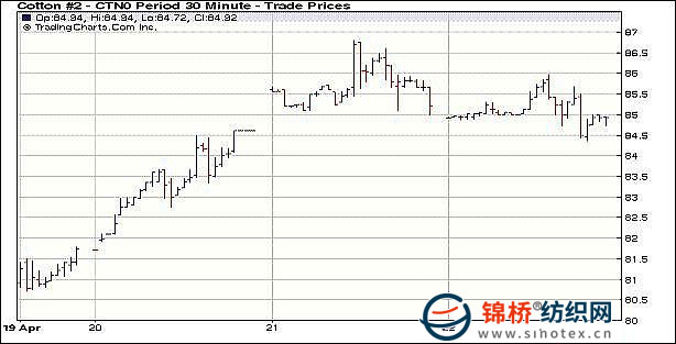 4月22日,歐盟統(tǒng)計局預計希臘債務(wù)規(guī)??赡艹^預期,憂慮攀升,美元指數(shù)再度大幅沖高,金屬等大宗商品承壓回落;然而谷物類整體小幅收漲,美棉出口較佳,但紐約期棉整體上寬幅震蕩,盤終近期和主力合約收跌。經(jīng)過連續(xù)兩日的攀升后,22日紐約期棉開盤后小幅回落,強勁的美棉出口數(shù)據(jù)和印度的政策雖然助推期棉拉高,但希臘債務(wù)規(guī)模憂慮及外溢效應(yīng)令歐元承壓,推動美元指數(shù)大幅走高,金屬等商品的回落也為期棉帶來壓力,因此ICE期棉當日走勢呈現(xiàn)寬幅震蕩,沖高后回落,盤終近期和主力合約小幅收跌,成交較前日大幅縮量。據(jù)美國農(nóng)業(yè)部(USDA)統(tǒng)計,4.9-4.15日美國凈簽約出口本年度陸地棉75522噸,較前一周增加24%,較近四周平均增加82%。中國當周凈簽約進口本年度陸地棉44043噸,裝運32772噸。 紐約棉花期貨近期1007合約近三個交易日交易走勢 |
