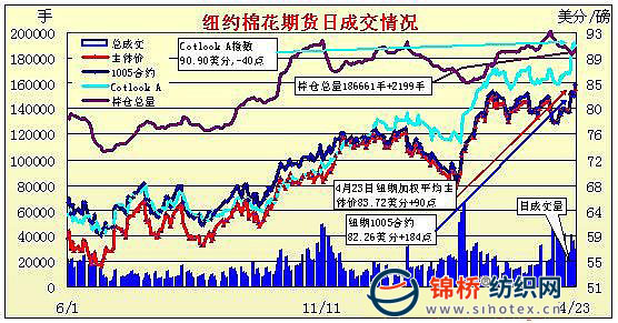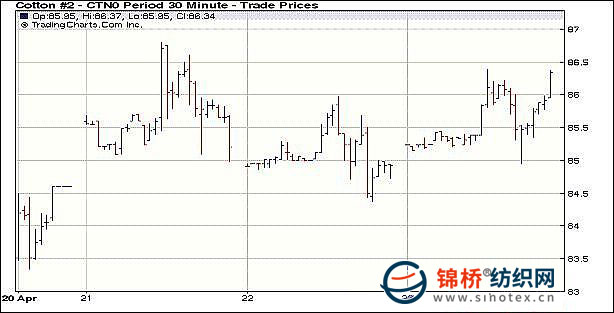 4月23日,美元回落,原油攀高,紐約期棉走勢強(qiáng)勁,穩(wěn)定的需求推動(dòng)期棉再度攀升,盤終7月主力合約漲138點(diǎn)收于86.20美分。當(dāng)日早盤,期棉小幅震蕩,隨后在外圍利好氛圍下快速拉升沖高,主力7月合約最高飆升至86.38美分,高位回落,不過基于現(xiàn)貨面穩(wěn)定的需求,美棉簽約的大幅增加刺激本年度2份合約再度大漲,直至收盤,成交較前幾日有明顯縮量。 紐約棉花期貨近期1007合約近三個(gè)交易日交易走勢 |