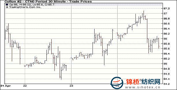 4月26日紐約期棉延續(xù)周五強(qiáng)勢,繼續(xù)沖擊新高,但買盤跟進(jìn)力度較弱,致使高位回落,盤終近期合約和主力合約小幅收跌。當(dāng)日紐約期棉早盤窄幅震蕩,隨后穩(wěn)步攀升,強(qiáng)勢上揚(yáng),7月合約再度沖擊新高,盤中最高87.10美分,但沖擊新高后買盤疲弱,同時賣盤獲利打壓,兼外圍大宗商品走勢疲弱,致使期棉快速回落,近期合約小幅收跌。根據(jù)ICE規(guī)定,由于5月合約和7月合約均收于84美分之上,因此紐約期棉的漲跌幅度依然為400點(diǎn)。 紐約棉花期貨近期1007合約近三個交易日交易走勢 |