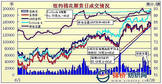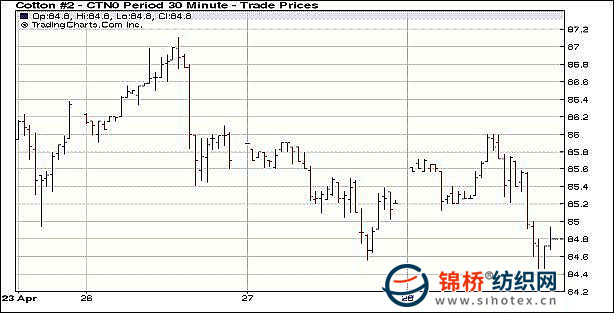 4月28日美聯儲決定維持低利率,且重申將在較長的時間內維持不變,同時美聯儲聲明經濟形勢趨好,緩和了歐元區(qū)經濟引發(fā)的憂慮,但大宗商品表現一般,紐約期棉主力合約早盤揚升,午盤后回落,盤終僅7月合約小幅收跌,其它合約小幅收陽。28日,美聯儲繼續(xù)維持低利率同時表態(tài)美國經濟繼續(xù)穩(wěn)步回穩(wěn)的聲明緩解了市場對于歐元區(qū)的憂慮,因此外圍市場從前日的恐慌情緒中有所恢復,ICE期棉隨外圍市場小幅上揚,7月合約最高沖至86美分整數關口,但高位之際,現貨需求減弱又打壓期棉快速下降,盤終主力合約收跌30點,但其它合約均小幅收漲。 紐約棉花期貨近期1007合約近三個交易日交易走勢 |