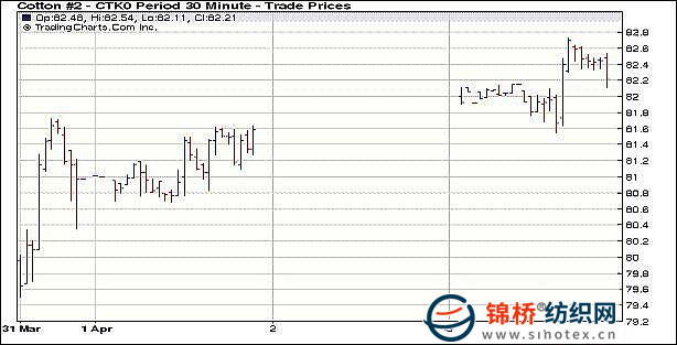 上周五公布的美國就業(yè)數(shù)據(jù)顯示美國經(jīng)濟(jì)穩(wěn)步回升,進(jìn)而提升大宗商品上揚(yáng),外圍強(qiáng)勢助推紐約期棉強(qiáng)勢走高,盤終5月合約漲78點(diǎn)收于82.28美分。當(dāng)日紐約期棉小幅高開,早盤窄幅震蕩,之后在原油大漲的刺激下期棉5月和7月合約強(qiáng)勢攀升走高,盤中近期5月合約最高揚(yáng)升至82.72美分/磅(+122),但尾盤高位回落,尾盤漲幅回落。受美國失業(yè)率回落提振,全球經(jīng)濟(jì)復(fù)蘇強(qiáng)勁,紐約原油價(jià)格周一收于每桶86美元之上,為18個(gè)月最高收盤價(jià);芝加哥COMEX期銅周一觸及20個(gè)月高位。 紐約棉花期貨近期1005合約近三個(gè)交易日交易走勢 |