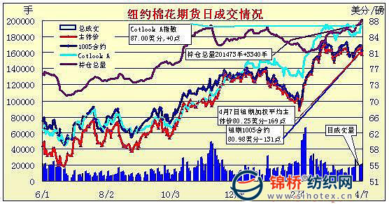 周三美聯(lián)儲(chǔ)主席貝南克表示美國(guó)經(jīng)濟(jì)依然面臨重大的阻力,包括樓市的復(fù)蘇還未令人信服,同時(shí)就業(yè)市場(chǎng)不振,兼希臘財(cái)政再現(xiàn)危機(jī),美元周三繼續(xù)走強(qiáng),股市下跌,原油金屬等大宗商品回落,紐約期棉盤中快速跳水,盤終5月合約跌131點(diǎn)收于80.98美分/磅。當(dāng)日期棉小幅高走,但開盤后小幅回落,窄幅震蕩;美元指數(shù)上揚(yáng),股市和包括原油在內(nèi)的大宗商品期貨回落,刺激ICE期棉盤中大幅跳水,近期5月合約最低觸及80.56美分/磅,尾盤略有回升,收于81美分之下。遠(yuǎn)期合約跌幅較小,12月合約僅收跌30點(diǎn)。當(dāng)日,轉(zhuǎn)倉(cāng)交投和基于技術(shù)面的賣盤活躍,總持倉(cāng)突破20萬張,增至201581張,為2008年9月26日以來新高。 紐約棉花期貨近期1005合約近三個(gè)交易日交易走勢(shì) |