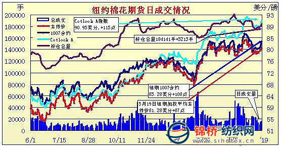 5月19日紐約期棉再度走高,近期7月合約收于83.28美分/磅,上漲108點(diǎn);1012月合約78.11美分/磅,漲20點(diǎn)。7/12月合約轉(zhuǎn)倉(cāng)活躍,市場(chǎng)總成交量有所增加。中國(guó)期現(xiàn)貨市場(chǎng)繼續(xù)走強(qiáng),企業(yè)對(duì)美棉詢盤和采購(gòu)增加,對(duì)紐約期棉形成支持,另有技術(shù)買盤介入,以及美元走弱,促使市場(chǎng)強(qiáng)勢(shì)開盤,7月合約短時(shí)間內(nèi)即沖高到84.13美分/磅,漲幅近200點(diǎn),達(dá)到兩周來(lái)高點(diǎn)。后市7/12月合約轉(zhuǎn)倉(cāng)活躍,近期合約漲勢(shì)遭到抑制,市場(chǎng)回吐部分漲幅,但最終仍普遍收漲。 紐約棉花期貨首期1007合約近三個(gè)交易日交易走勢(shì) |