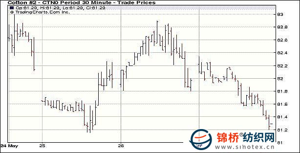 5月27日紐約期棉近期7月合約繼續(xù)受壓走弱,其它近月合約小幅收漲,遠期合約收跌,目前7月合約與12月合約之間的差價為274點。當日外圍市場利好,美元走弱,美股及商品期貨市場普遍走強。紐約期棉近期7月合約平開后一度走高,最高至82.36美分/磅,但之后受到轉倉交易的打壓,午盤后明顯回落,盤終收于81.28美分/磅,跌56點;1010至1107合約小幅收漲12-42點,其它遠期合約小跌。當日12月合約成交量超過7月合約,持倉量增3909張,至74606張。 紐約棉花期貨首期1007合約近三個交易日交易走勢 |