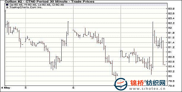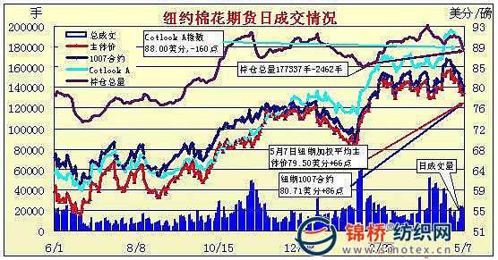 5月7日大量商業(yè)買盤涌入,促使市場止跌反彈,近期7月合約收于80.71美分/磅,漲86點,1012月合約收于75.67美分/磅,漲16點。前一日紐約股市可能因某交易員誤操作,導(dǎo)致美股大幅下挫,影響商品期貨及期棉大跌,7月合約跌至80美分以下。7日,現(xiàn)貨市場需求穩(wěn)定,促使紡織廠買盤涌入,市場穩(wěn)定開盤,盤中大幅上漲,7月合約最高上沖至82.29美分/磅(+244點)。外部市場美元下跌,商品市場反彈,給期棉市場一定支持力度。最后階段買盤動能減弱,市場回吐部分漲幅,終以小漲收盤。