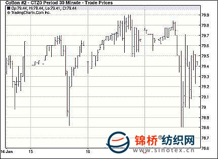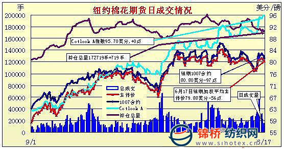 6月17日美元下挫,而最新的美棉出口周報顯示前周美棉銷售一般,投機(jī)賣盤再度打壓期棉,盤終近期合約中幅收跌,其它小幅小跌收盤。當(dāng)日紐約期棉交投缺乏亮點,移倉交投繼續(xù)主導(dǎo),主力12月合約波動幅度較大,最高79.84,最低78.69美分,早盤窄幅震蕩,其后賣盤打壓,兼技術(shù)面壓力,致使12月合約快速回落,但低位買盤支撐12月合約回升,盤終僅小幅收跌。據(jù)美國農(nóng)業(yè)部報告,6月4日-6月10日美國凈簽約出口本年度陸地棉66565噸,比前一周減少53%;但同時簽約新年度棉花54590噸,顯示需求旺盛。 紐約棉花期貨主力1012合約近三個交易日交易走勢 |