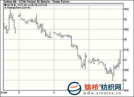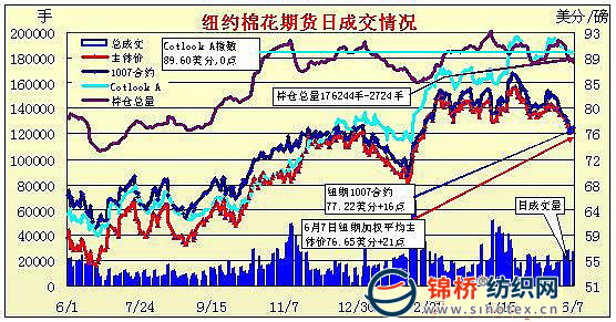 5月7日紐約期棉市場(chǎng)止跌反彈,成交增量,各合約小幅收漲。當(dāng)日市場(chǎng)平開(kāi)后持續(xù)下跌,近期7月合約最低至75.80美分/磅,12月合約最低至74.09美分/磅。后低位買(mǎi)盤(pán)涌入市場(chǎng),期棉快速反彈,盤(pán)終小幅收漲。7月合約收于77.22美分/磅,漲16點(diǎn);12月合約收于75.51美分/磅,漲23點(diǎn)。 紐約棉花期貨首期1007合約近三個(gè)交易日交易走勢(shì) |