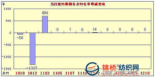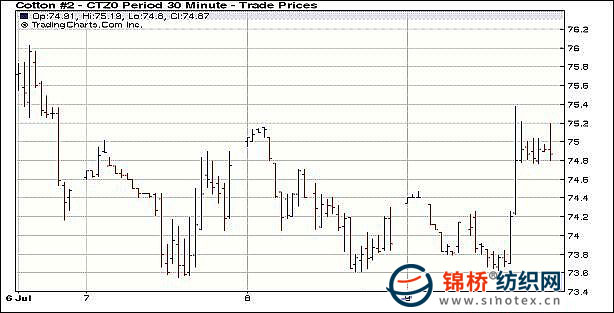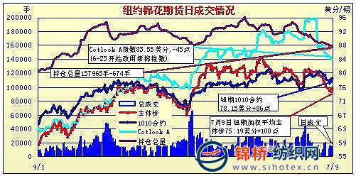 7月9日,紐約期棉2009/10年度的最后一個合約1007合約終結(jié)交易,終盤收盤價81.85美分/磅,僅高于新棉約4美分左右。受美國新棉出口量持續(xù)增加利好及美農(nóng)業(yè)部2010/11全球棉花預(yù)測報告全球產(chǎn)量調(diào)增幅度大于消費增幅雙重因素,紐約期棉尾盤反抽,但幅度不大,全線收漲近百點。10月合約收于78.15美分,漲86點;主力12月合約收于74.99美分,漲100點。但交投不旺,持倉下降。據(jù)美農(nóng)業(yè)部出口周報顯示,6.25-7.1日一周里,美國新棉出口簽約6.32萬噸,較前一周增加1.3%,已連續(xù)兩周高量出口。當周中國簽約新棉2.75萬噸,占43.5%。另據(jù)美農(nóng)業(yè)部全球棉花7月份預(yù)測報告稱,2010/11年度,全球棉花產(chǎn)量2526萬噸,較上月預(yù)測值調(diào)增36.9萬噸,其中美棉增34.8萬噸;全球消費2606.2萬噸,調(diào)增4.5萬噸,小于產(chǎn)量增幅,其中巴基斯坦調(diào)減2.1萬噸;預(yù)測全球期末庫存1086.7萬噸,調(diào)增7萬噸,其中美國76.2萬噸,調(diào)增15.2萬噸。 紐約棉花期貨主力1012合約近三個交易日交易走勢 |