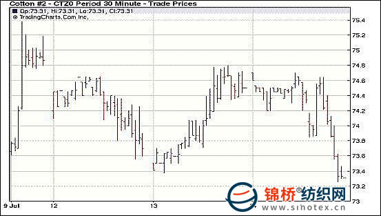 7月14日美聯(lián)儲(chǔ)下調(diào)美國(guó)下半年GDP預(yù)期,并表態(tài)如果美國(guó)經(jīng)濟(jì)前景進(jìn)一步惡化,應(yīng)繼續(xù)出臺(tái)進(jìn)一步的刺激舉措;紐約期棉午盤承壓大幅回落。當(dāng)日,紐約期棉早盤窄幅波動(dòng),走勢(shì)相對(duì)平穩(wěn),但午盤后受美國(guó)零售數(shù)據(jù)不佳打壓,大多數(shù)品種盤中均大幅回落,期棉主力合約跌破支撐位73.50美分,最低探至73.21美分,貿(mào)易買盤低位介入,阻止期棉再度滑落,但盤終12月合約依然大跌130點(diǎn),收在73.35美分,其它大多數(shù)合約中幅回落。 紐約棉花期貨主力1012合約近三個(gè)交易日交易走勢(shì) |