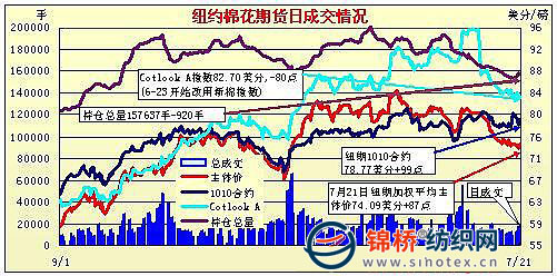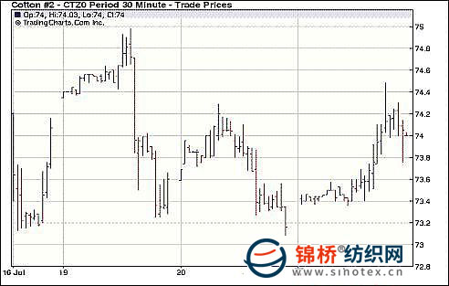 7月21日,美聯(lián)儲主席伯南克表示美國經(jīng)濟依然面臨較多的不確定性,美聯(lián)儲準備在需要的時候采取進一步措施提振經(jīng)濟,美國股市受挫回落,紐約期棉在73美分支撐處技術買盤,推動期棉反彈走高,盤終紐約期棉收漲百點左右。隨著期棉合約前兩日連續(xù)下跌逼近73美分,技術買盤于21日入場,紐約期棉小幅高開并走升,顯示期棉12月在73美分的支撐較強,不過成交低迷,持倉繼續(xù)萎縮,盤終期棉主力合約略有回落,但最終收漲近百點。分析人士認為,期棉短期或將繼續(xù)維持73-75美分的區(qū)間震蕩。后市美棉長勢良好,同時傳言印度棉種植面積增幅較大,均將為期棉帶來壓力。 紐約棉花期貨主力1012合約近三個交易日交易走勢 |